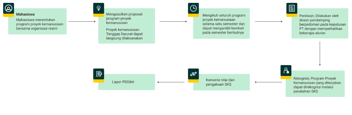 Keterlibatan mahasiswa dalam proyek kemanusiaan dapat disalurkan Perguruan Tinggi melalui Program Proyek Kemanusiaan. Program Proyek Kemanusiaan (PPK) dalam Merdeka Belajar Kampus Merdeka (MBKM) merupakan salah satu hak belajar di luar program studi (Prodi) bagi para mahasiswa UM-Tapsel. PPK-MBKM UM-Tapsel berjalan selama minimum 1 (satu) semester dan maksimum 2 (dua) semester diharapkan dapat memberikan pengalaman yang cukup melalui pembelajaran langsung di lokasi proyek-proyek kemanusiaan kepada mahasiswa UM-Tapsel. PPK-MBKM diselenggarakan melalui kerjasama dengan mitra antara lain institusi pemerintah, yayasan nirlaba, organisasi multilateral, lembaga swadaya masyarakat, dan perusahaan. Selama PPK-MBKM, para mahasiswa akan mendapatkan hard skills (complex problem solving dan analytical skills), maupun soft skills (etika, komunikasi, dan kerjasama). Di pihak lain, mitra mendapatkan sumberdaya dari mahasiswa yang memiliki talenta yang dapat membantu terlaksananya PPK-MBKM tersebut secara efektif dan efisien. Mahasiswa yang terlibat PPK tersebut akan lebih adaptif dan memiliki keterampilan serta keahlian yang relevan ketika mereka ingin mengabdi pada proyek- proyek kemanusiaan lainnya.